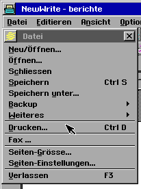 Dies ist das Drucken-Werkzeug in der Werkzeugleiste. Wenn Sie mit der linken Maustaste darauf klicken, wird das Dokument an dem Sie gerade arbeiten, gedruckt. Nachtürlich müssen Sie vorher einen Drucker in den Voreinstellungen installiert und angeschlossen haben. Sie gelangen auch über das Menü zum ausdrucken, dies sieht dann so aus: