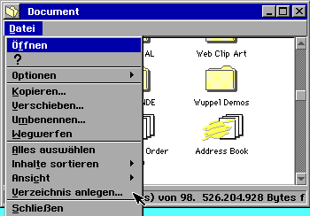 Errinnern Sie sich noch daran was Sie über den DeskTop gelernt haben? Wenn Sie zum DeskTop gehen und dort auf das DOCUMENT-Icon doppelklicken, wird das Document Fenster geöffnet. Dann klicken Sie mit der linken Maustaste einmal auf DATEI. Ein Menü erscheint. Ein Punkt davon ist "Verzeichnis anlegen". Dies sieht dann so aus: