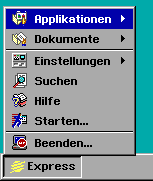Wenn Sie mit der linken Maustaste auf den EXPRESS-Knopf klicken, erscheint ein MENÜ ähnlich dem Bild links. Das Menü gibt Ihnen einige Wahlmöglichkeiten. Wir haben hier nur 3 Grund Wahlmöglichkeiten. VERLASSEN - wenn Sie auf Verlassen klicken, beenden Sie die NewDeal Software um so z.B. den Computer ausschalten zu können. Klicken Sie mit der linken Maustaste auf Verlassen und wählen Sie danach in der kleinen Dialogbox, was Sie wünschen. Danach können Sie den Computer ausschalten. APPLIKATIONEN - ein Links-Klick hier öffnet ein weiteres Menü, damit Sie wählen können welche Applikation gestartet werden soll. Z.B. können Sie NewWrite oder NewDraw öffnen. Die nächste Seite zeigt Beispiel dazu. DOKUMENTE - ein Links-Klick hier öffnet ein weiteres Menü. Dies ist eine Liste aller Dokumente aus dem DOCUMENT-Verzeichnis. Wählen Sie ein Dokument indem Sie auf den Namen klicken. Es wird für Sie geöffnet. |